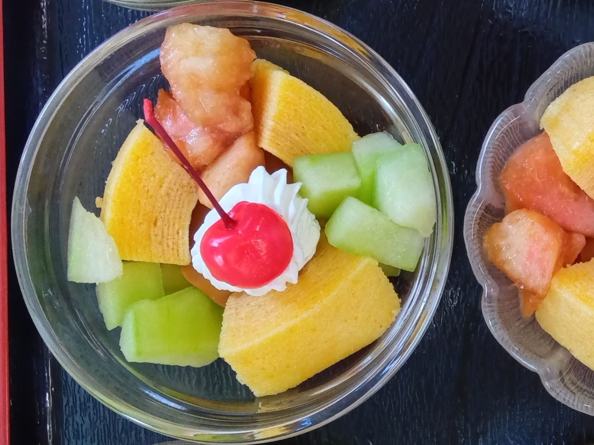 メロンや桃をたっぷりと、プリンには生クリームにプリンの定番、サクランボも
